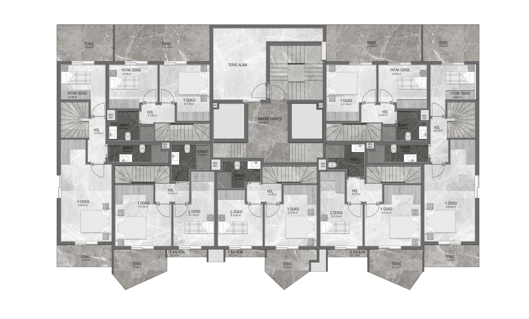 Ruby Plus Residence, the latest member of the Ruby Resiedence series, is located in Mahmutlar neighborhood and consists of a total of 63 flats as a single block, 9 floors and 56 units of 50 m2 1+1 flats, 7 units of 110 m2 2+1 duplex flats.