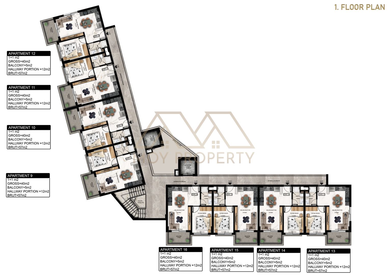 1+1 м² Нетто = 40 м² Балкон = 5 м² Брутто = 57 м²