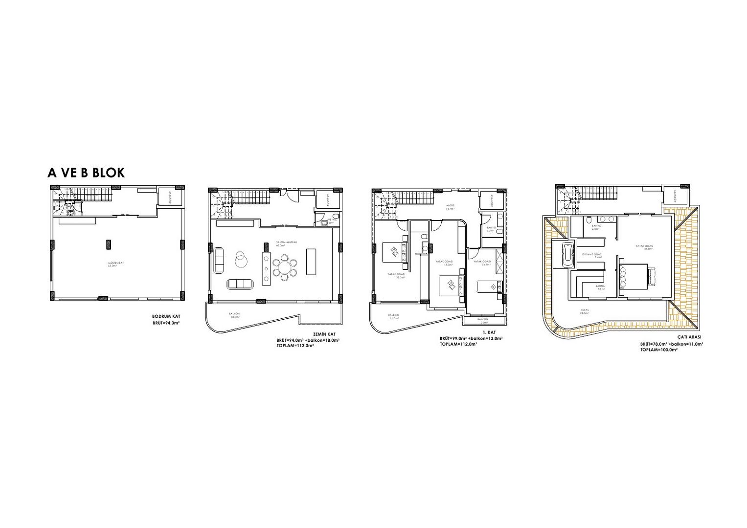 Площадь земельного участка для 6 вилл составляет 2735 м2. Виллы типа A,B,C,D имеют общую площадь 419 м2 и жилую - 292 м2. Виллы типа E и F обладают общей площадью 344 м2 и жилой 223 м2. Для каждой виллы предусмотрен лифт, собственная парковка и беседка для барбекю, а также приватный открытый бассейн. На террасах домов предполагается наличие джакузи и сауны, что можно изменить по желанию покупателя.