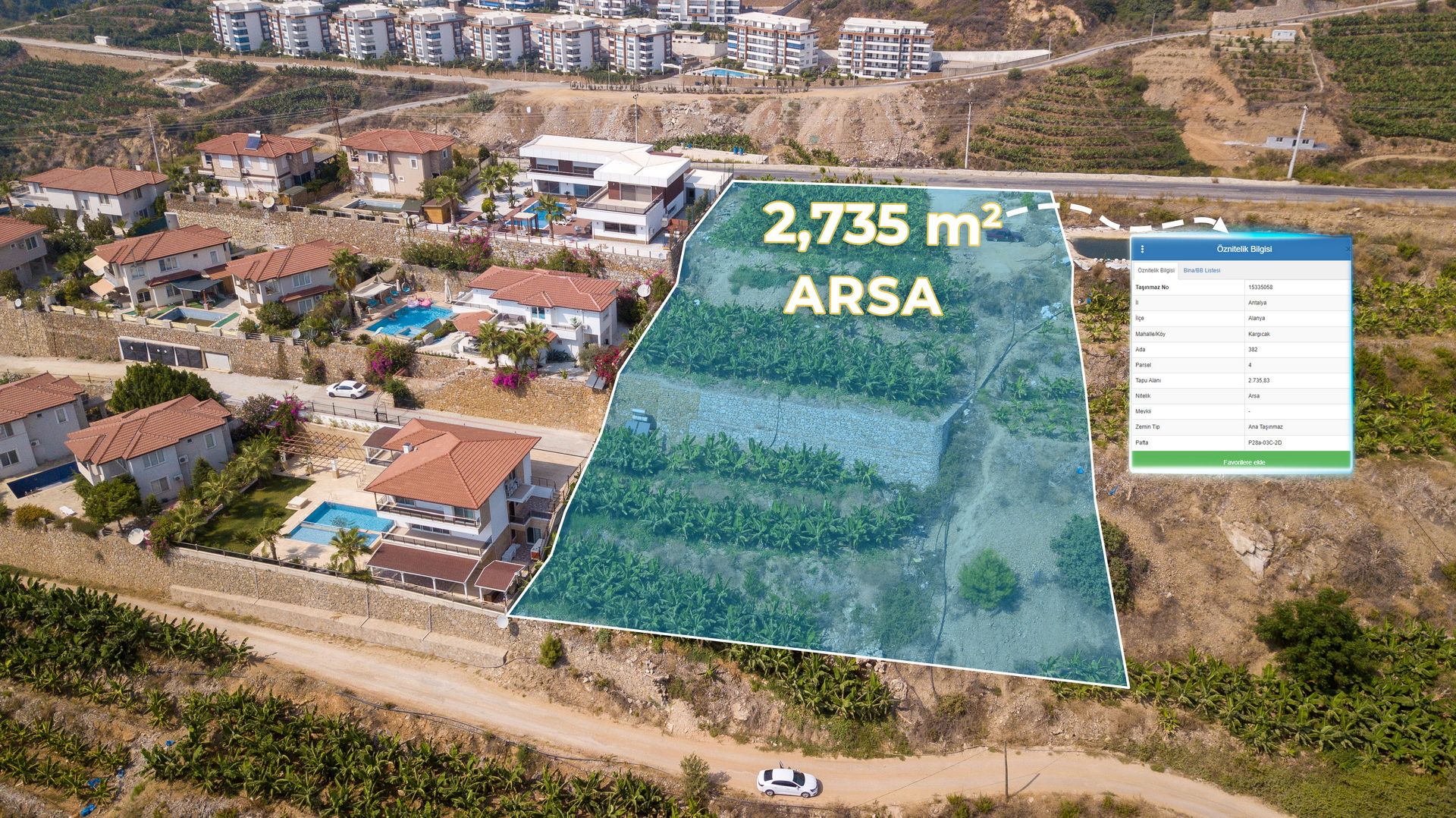 Земельный участок, где будет находиться проект, расположен каскадом, таким образом каждая вилла будет обладать шикарным панорамным видом на Средиземное море и бескрайние Торосские горы. Кроме того, добраться до комплекса вилл на авто можно всего за 5 минут от центра района Каргыджак. Расстояние до моря составит 2,7 км.