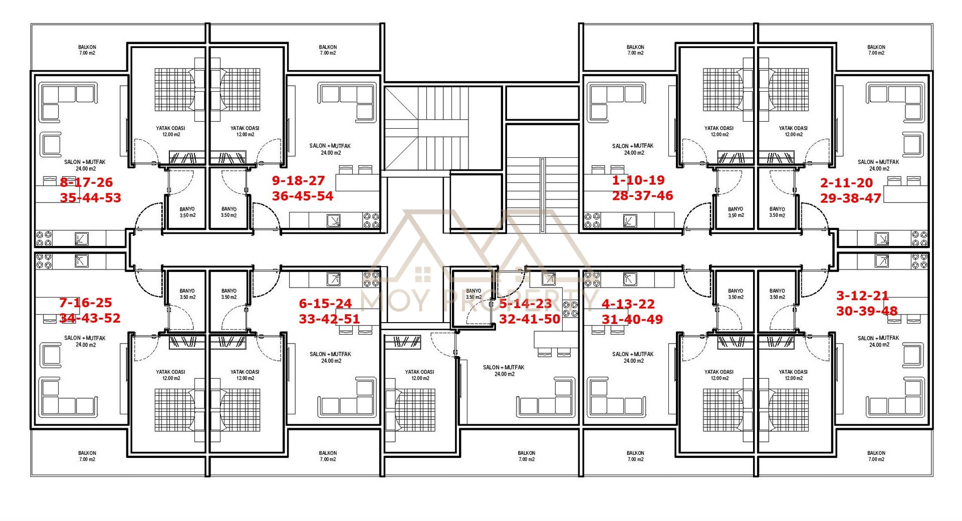 Proje 8 Katlı 2 Blok ve toplam 86 daireden oluşmaktadır.
