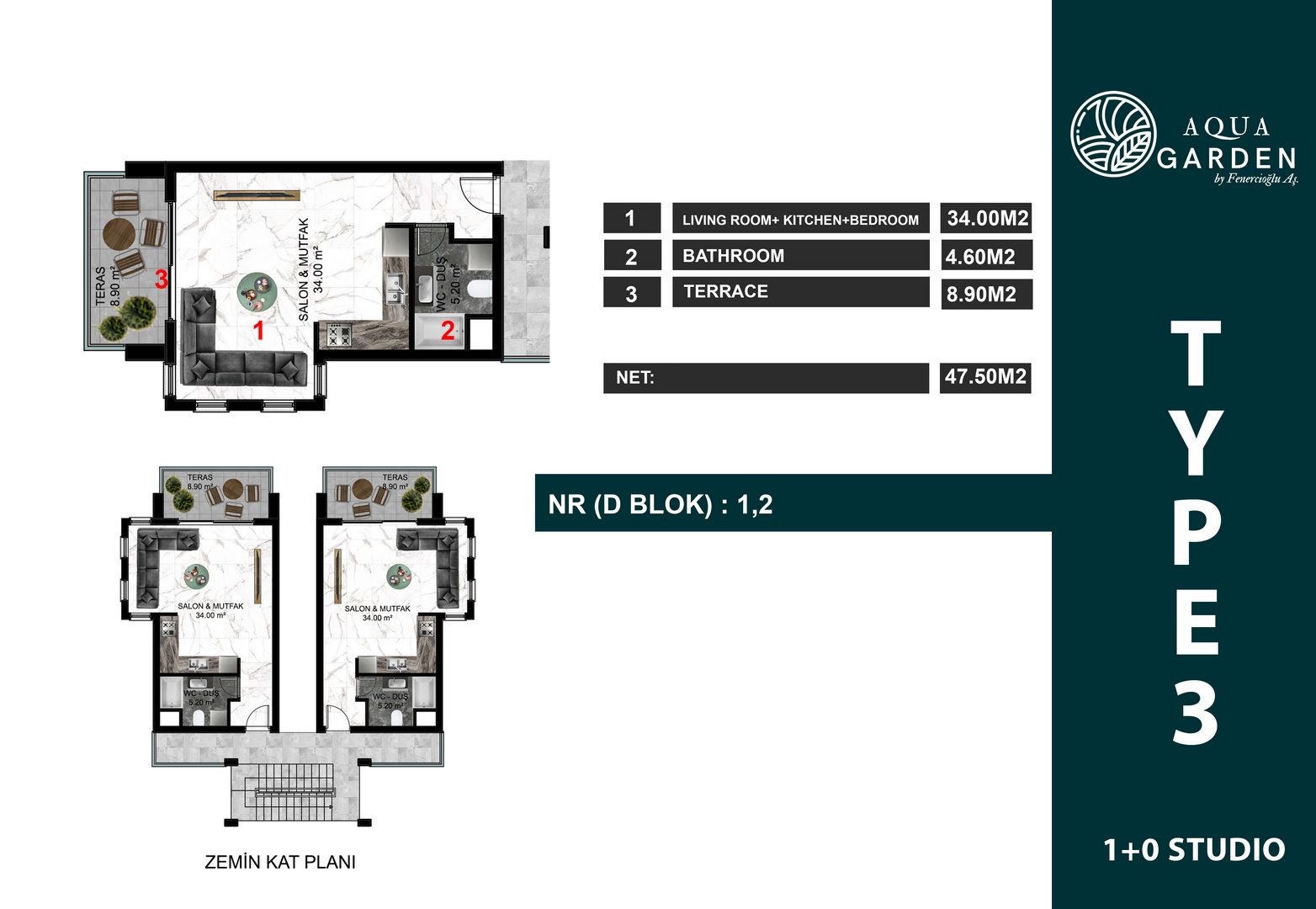1+1 teras - 47,90 m2 + 45 m2 teras = 92,90 m2